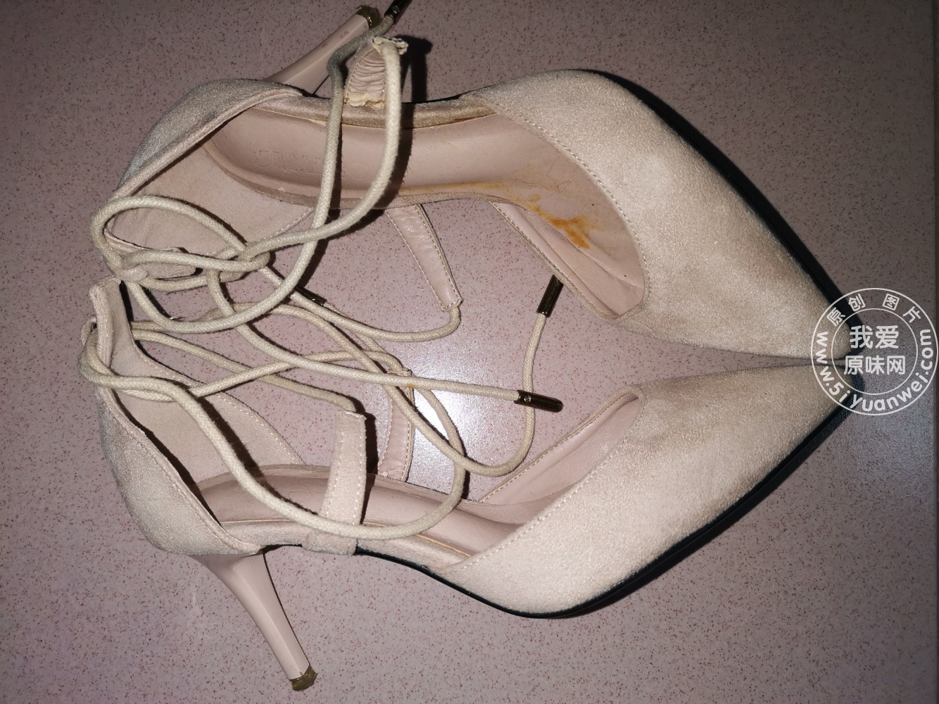 粉色绒面系带高跟凉鞋